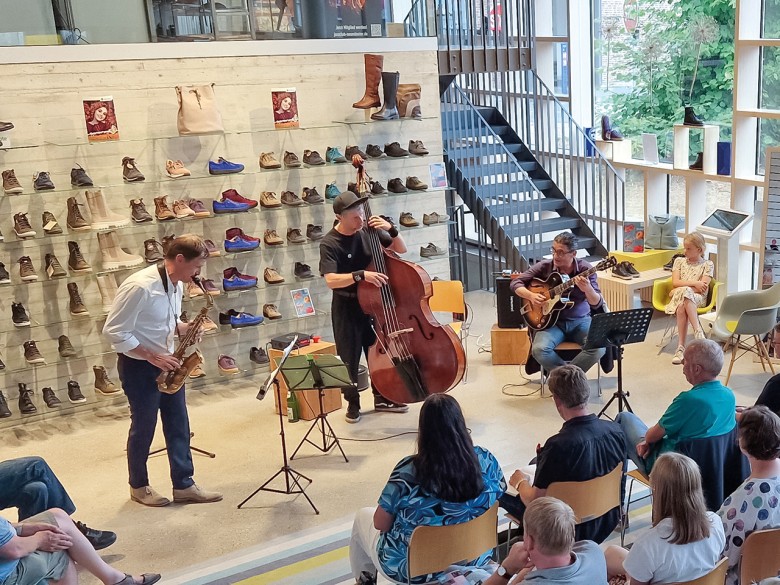 „Kultur im Schuhregal“ ist das Motto der von Kirsten Graßmay initiierten Veranstaltungsreihe, unter dem das Schuhhaus seit 2020 sechs- bis siebenmal pro Jahr für Konzerte, Lesungen oder Theater öffnet. stüben fuß & schuh blickt auf eine ange Geschichte und vier Stüben-Generationen als Familienunternehmen zurück. Tochter Kirsten Graßmay stieg im Jahr 2002 mit in die Führungsriege des Unternehmens ein neben ihren Eltern Rainer und Erika Stüben, die sich inzwischen aus dem Tagesgeschäft zurückgezogen haben. Der im Jahr 2016 eröffnete großzügige, helle und moderne Erweiterungsbau bietet das optimale Ambiente für „Kultur im Schuhregal“, Platz für rund 100 Zuschauer und sorgt architektonisch und akustisch für eine besondere Atmosphäre.