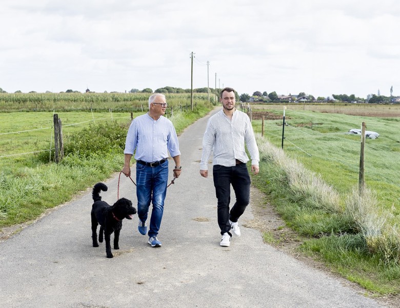 Guido (links) und Johannes Jansen beim Spaziergang mit Hund Oswalt im Umfeld von Waldenrath